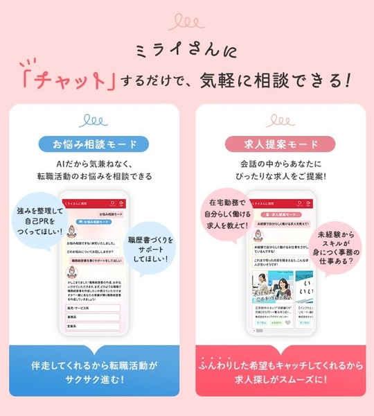 現状は「お悩み相談モード」と「求人提案モード」があり、求職者の方はミライさんにチャットするだけで、気軽に転職活動の相談をすることが可能です。