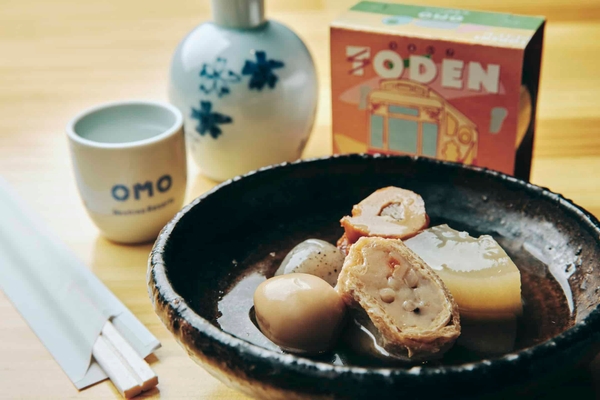 日本酒のお供には、おすすめの熱燗に合うおつまみとしてご近所さんにセレクトしてもらった缶詰を用意します。焼き鳥缶や鯖缶などの定番のおつまみから、ルーローハンやスペアリブなど、日本酒と意外なマリアージュを楽しめる変わり種まで種類豊富に揃えています。10種の缶詰のうちひとつは、OMO5東京大塚オリジナルのおでん缶「都電おでん」です。関西風の透き通った出汁に、王道の大根、ごぼう巻きやこんにゃく、うずらの卵など5種類の具が入っています。練り物や野菜の旨味が凝縮された本格的な味わいのおでんの缶詰です。それぞれの缶詰と熱燗の組み合わせを楽しめます。