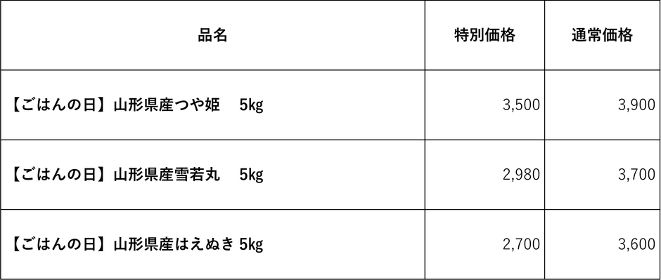 このイベントは、「小さなYAMAGATAマルシェ」が独自で制定した“にこにこ「ごはんの日」”に限り、対象の山形県産のお米を最大25%の割引価格で販売するイベントです。お米を通常よりもお得に・気軽にネットショップで購入していただき、消費拡大をはかるのが狙いです。山形県の主要3品種のお米「つや姫」「雪若丸」「はえぬき」が対象となり、「つや姫」は外観・食味・香り全てが高水準のお米、「雪若丸」は粘りと硬さが新食感のお米、「はえぬき」は食べ飽きないバランスがとれたお米です。