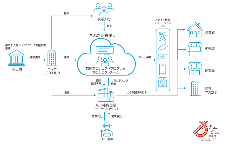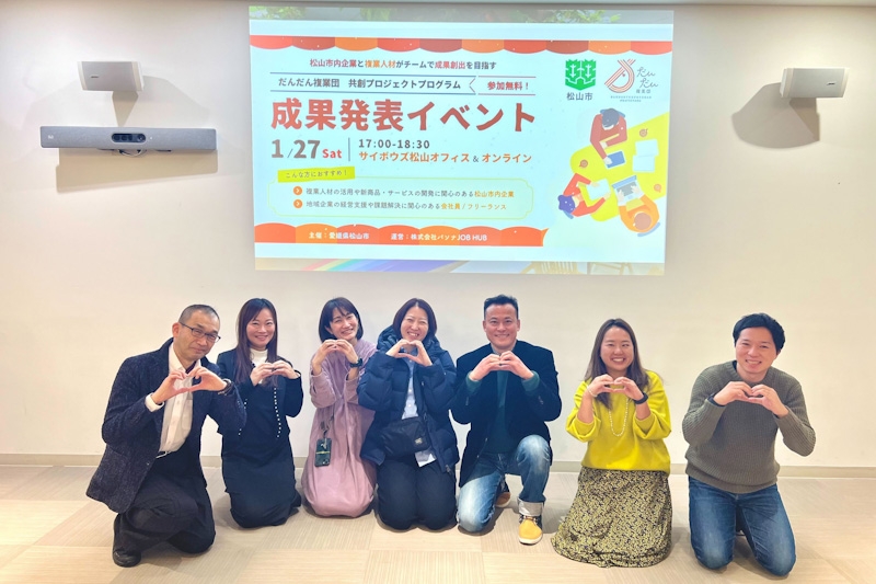 「だんだん複業団※」とは、松山市「都市部人材デュアルワーク支援業務」の一環として、様々な課題を抱える松山市内企業と自らのスキル・経験を生かしたい都市部人材による複業マッチングを通じて、企業の課題解決や人材の多様な働き方を目指すコミュニティです。