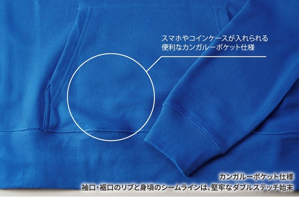 俺流総本家のパーカーは伸びやすい袖口・裾口のリブと身頃のシームラインに「ダブルステッチ」を採用しているので、着ては洗濯を繰り返してもヨレヨレになることはありません。