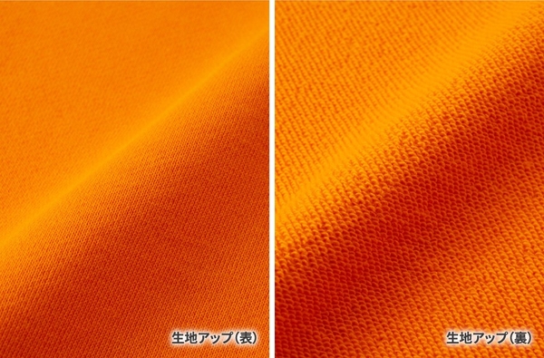 天竺編みを組み合わせた表面は伸縮性がありなめらかな風合い。裏面は裏糸をパイル状に編み込んで浮かせた生地で、タオルのように汗の吸収が良い素材。裏糸は表糸に使用している糸よりあま撚りの太い糸で編み立てているため、肌ざわりが良いのが特徴。