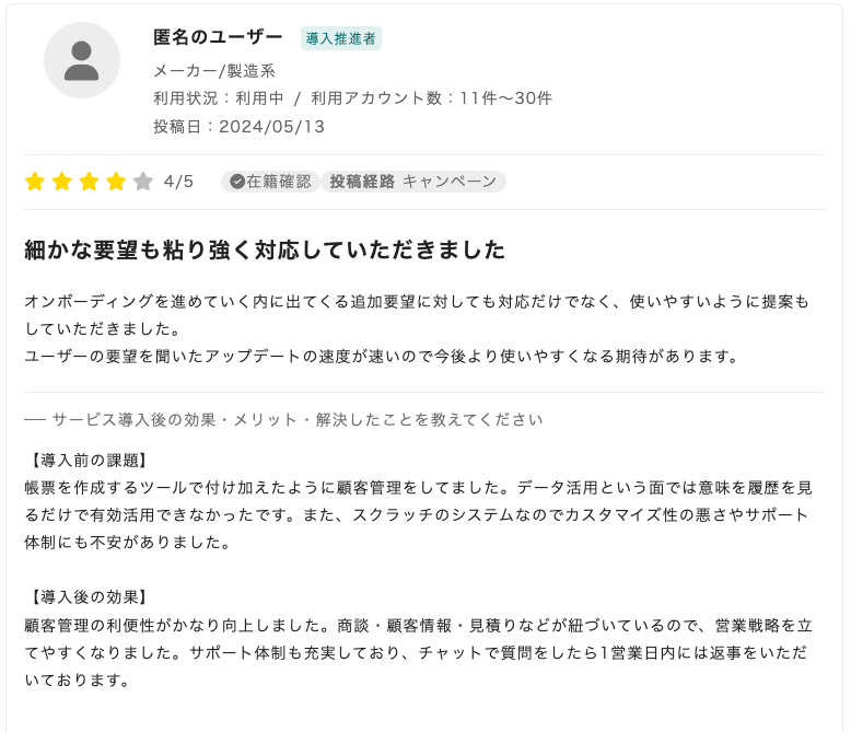 ※出典:スマートキャンプ株式会社「BOXIL」:https://boxil.jp/service/4102/reviews/58251/