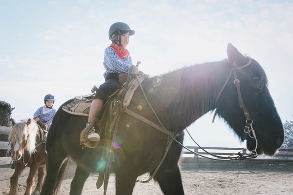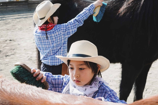 チェックのシャツにバンダナを締め、帽子を被ってホテルから約10分の馬場に行きます。馬場では、トレーナーが普段実際に行っている作業を体験します。厩舎の掃除から始まり、ブラッシングや体調チェック、決まった時間の餌やり。その後、鞍や手綱、鐙など馬具の装着もお子様自身が行ない、引き馬ではなくひとりで馬に乗ります。世話をしてから乗馬することで徐々に馬との信頼関係も築いていく体験です。また、信頼関係が築けたことでコミュニケーションが取れ、馬の特徴に自ら気づけるようになります。