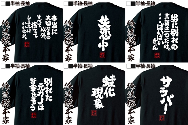 俺流総本家の語録Tシャツは、1万種類以上のデザインを取り揃えています。面白いものから感動的なものまで、多彩なデザインがあり、お客様一人ひとりの個性を引き立てる一枚を見つけることができます。カスタマイズ可能なデザインもあり、特別なイベントやギフトにも最適です。