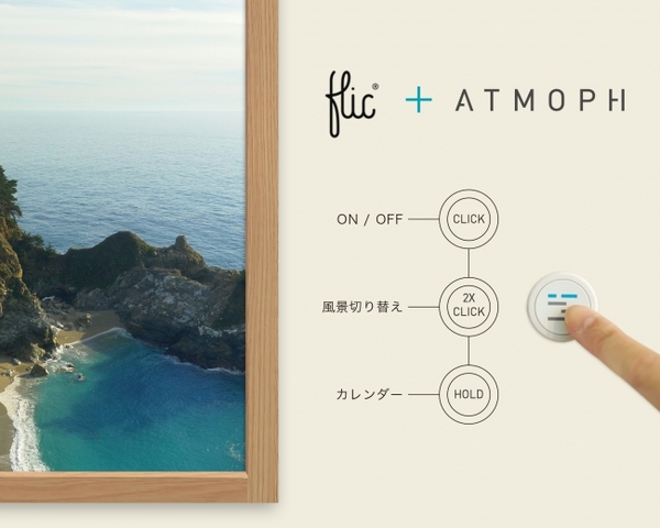 今回のリリースを記念し、4月5日(木)から5月7日(月)の期間中に公式サイトよりAtmoph Windowをご購入いただいた方の中でご希望者様に、AtmophオリジナルのFlicをプレゼントいたします。Flicは、IFTTTと連携し、ボタンを押すだけで様々なアクションが行うことができるスマートボタンです。Atmoph Windowと連携すれば、Atmoph WindowのスリープモードON/OFF、風景の切り替え、カレンダー表示・非表示などの操作ができます。