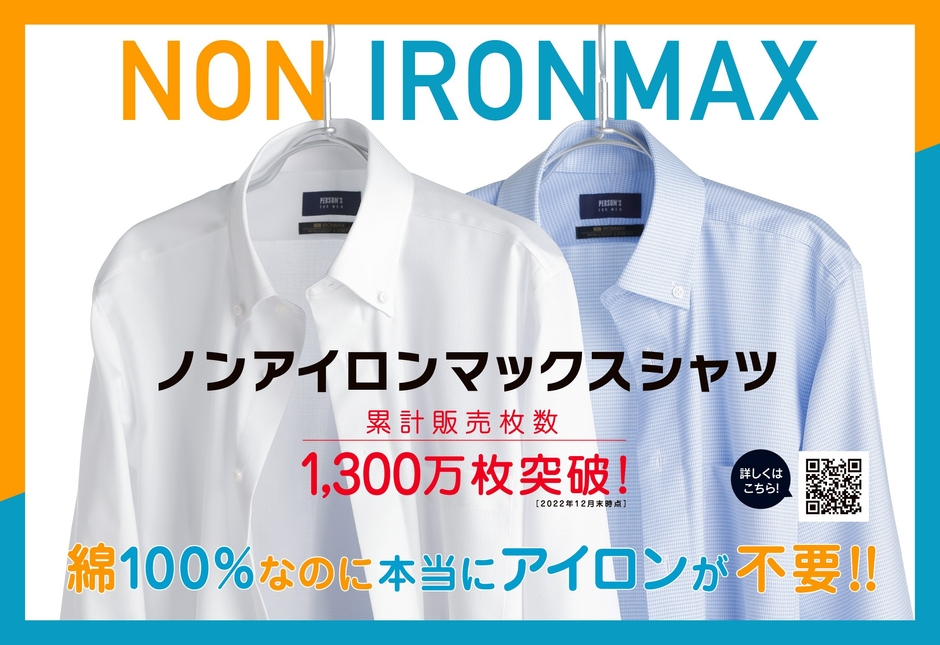 青山商事株式会社(本社:広島県福山市/代表取締役社長:青山理(おさむ))はこの度、「洋服の青山」で販売する綿100%でありながらアイロンがけ不要のロングセラー商品「NON IRONMAX(ノンアイロンマックス)シャツ」の累計販売枚数が 1,300万枚(2022年12月末)を突破したことをお知らせします。