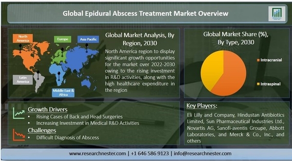 膿瘍の形成は、体内の血液と酸素の供給を妨げる可能性があり、臓器に深刻な損傷を与える可能性があり、昏睡または死につながる可能性があります。硬膜外膿瘍は、初期段階で投薬によって治療できますが、膿瘍が血管を塞ぎ始めた場合は手術が必要です。硬膜外膿瘍の緊急治療の必要性は、市場の成長を促進すると推定されます。さらに、研究開発活動への投資の増加は、市場の成長を後押しすると推定されています。