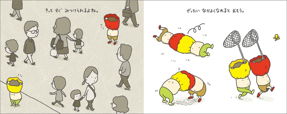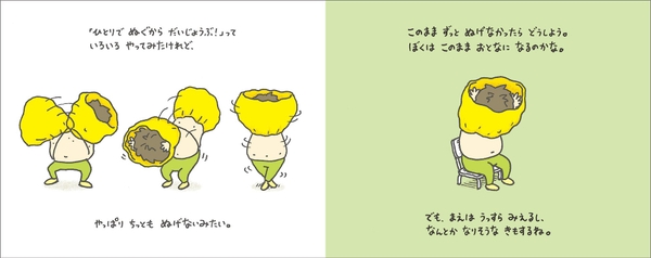 ふくがひっかかってぬげなくなって、もう どれくらいたったのかしら。このままずっとぬげなかったらどうしよう。 このままおとなになるのかな。ぬがないまま、工夫しながら生きる? ぬげない仲間をみつけて、たのしく生きる? あれこれ考えるうち、だんだんおなかがさむくなってきて......