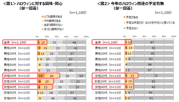 性年代別に見ると、女性の20~40代は比較的ハロウィンへの興味・関心が高く、今年のハロウィン関連で予定がある、あるいは予定は未定だが、なにかをやりたいと思っている人も多い。<図1・図2>