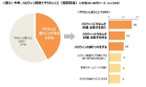 ハロウィンへの興味関心が高い女性20~40代が、今年のハロウィン関連でやりたいことは、「ハロウィンにちなんだ料理・お菓子を買う・作る」 「ハロウィンの飾りつけをする」 が上位。