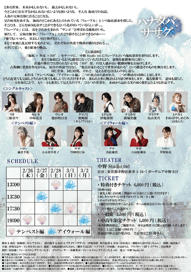 『ハナタバ、ササグ。』が2026年2月26日 (木) 〜 2026年3月2日 (月)に中野Studio twl(東京都 中野区 新井 3-16-7 B1F)にて上演されます。