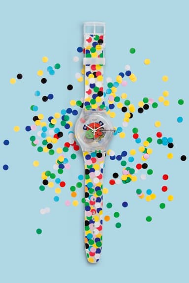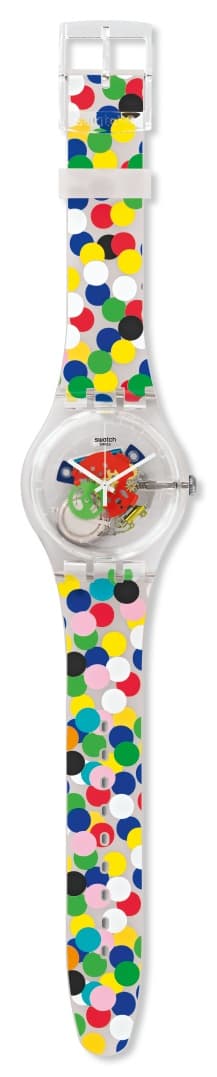 彼のスタイルはシンプル&エレガントが特徴で、SWATCHは長きに渡り友好的な関係を保ち、過去に5モデルのウォッチのコラボレーションをしてきました。そして今回再びタッグを組み、“スポット・ザ・ドット”を発表します。“スポット・ザ・ドット”は透明のプラスティックケースからは、カラフルに彩られたムーブメントエレメンツが見え、シリコンストラップにはイエロー、グリーン、レッドなどカラフルなドットが散りばめられていて、アレッサンドロ・メンディーニとスウォッチの初期のコラボレーションウォッチデザインを髣髴させる印象的なウォッチに仕上がりました。ドットのデザインを取り入れたスペシャルスリーブ付で展開いたします。
