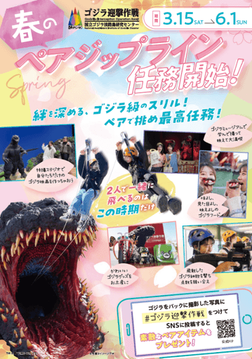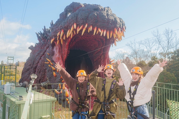 大迫力のゴジラに向かって“大滑空”女子旅ジップライン! 「春のペアジップライン 〜ゴジラを監視!記録写真をUPせよ!~」