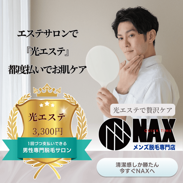 NAXの光エステは、男性特有の肌悩みに特化したスキンケア施術です。脱毛と組み合わせることで、より清潔感のある美肌を手に入れることができます。痛みも少なく、短時間で効果を実感できるため、忙しい男性にもおすすめです。