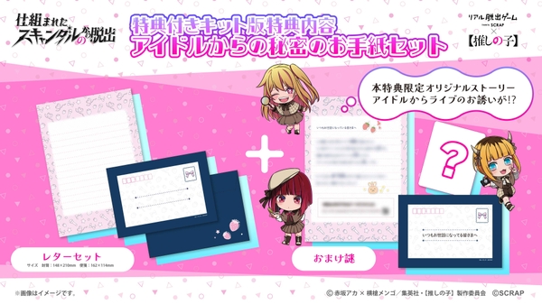 特典付きキット版の内容は「アイドルからの秘密のお手紙セット」。レターセットには、マイクやリボン、苺など、B小町メンバーを感じさせるモチーフが散りばめられており、"推し"へのファンレターや大切な家族への手紙にぴったりのデザインです。この特典だけのおまけ謎は、B小町から誘われたライブへの参加を目指すストーリー。本編終了後も【推しの子】の世界を満喫できる内容となっております。