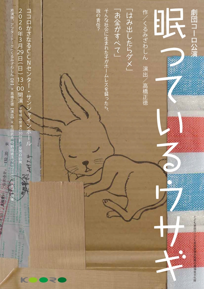 一般社団法人劇団コーロ(所在地:大阪府大阪市東住吉区中野、代表:澳 利子)は、人間の尊厳とは何かを問う、高校生によるホームレス殺人事件を題材にした演劇作品「眠っているウサギ」(作/くるみざわしん 演出/高橋正徳)の岐阜県瑞穂市公演(2026年3月29日)成功に向け、クラウドファンディングを開始いたしました。