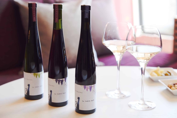 客室は、メゾネットタイプのスイートルーム「ワインスイートメゾネット」を用意します。1階には雄大な八ヶ岳連峰が描かれた壁紙が特徴の寝室、2階にはローソファーで寛げるリビングがあり、大きな窓からホテルのメインストリート「ピーマン通り」を一望できます。客室のワインセラーには同一ヴィンテージのドメーヌ ミエ・イケノ「シャルドネ」「ピノ・ノワール」「メルロー」の3種を用意。気候や土壌など同じ自然条件のもとで作られた品種による味わいの違いを堪能できます。