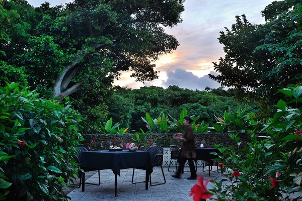 ディナーコースの始まりは、心地よい風が吹くテラスで提供するアペリティフです。命草(ぬちぐさ)のひとつであるシーショ(赤紫蘇)に、竹富島で祭事や行事の際に口にする泡盛と、塩を組み合わせたオリジナルのカクテルを楽しみます。ヤギのチーズを添え、泡盛酒粕を練りこんだちんすこうなど、2種の料理をカクテルとともに味わいます。風で草木がそよぐ音や虫の鳴き声、夕焼けから星空に移りゆく空の色など、竹富島の自然を体感しながら、その後に続くディナーコースへの期待感が高まる時間です。