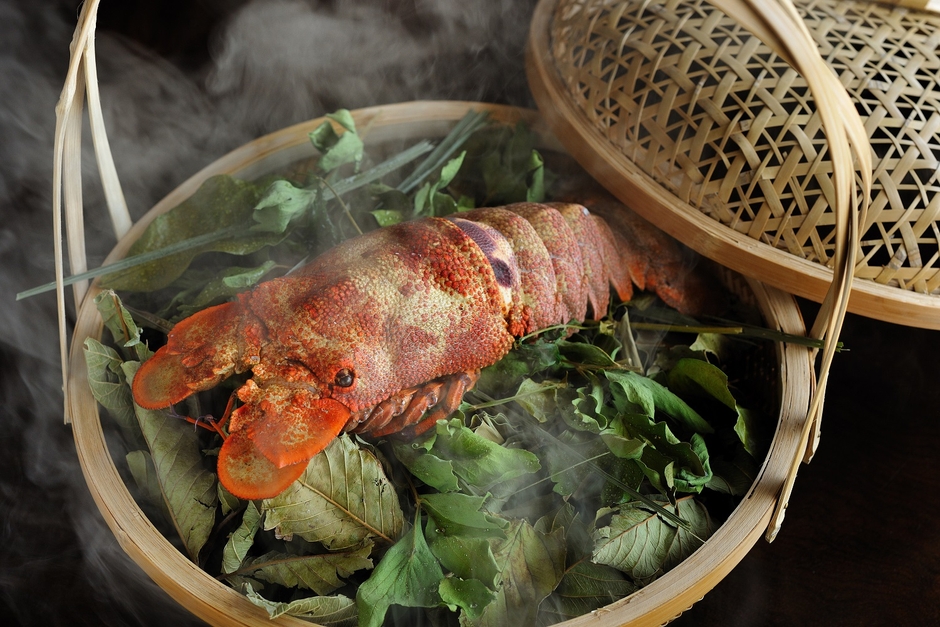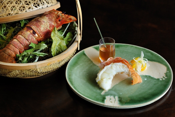 セミエビは温暖な浅海の岩礁やサンゴ礁に生息する海老です。名前の由来でもある蝉のような形をしている大きな体の中には、ぎっしりと身が詰まり、甘みが強いと言われています。漁獲量が少ないことから市場に流通することはほとんどなく、他の海老より美味とも言われ、幻の食材として知られている海老です。春から夏までの禁漁期間を終え、海水温度が下がったことでより身が引き締まった冬のセミエビを提供します。今冬の島テロワールは、島で親しまれている冬に旬を迎える食材を取り入れ、さらにセミエビを使用した新メニューを加えた、全8皿のディナーコースです。