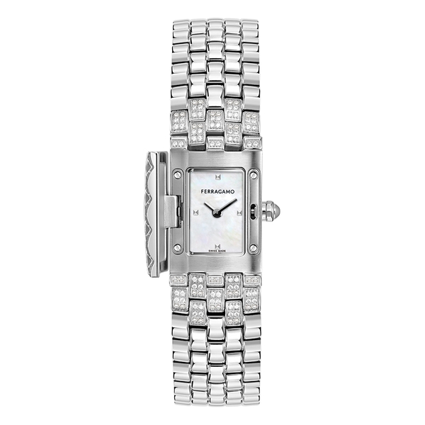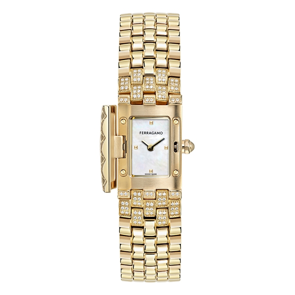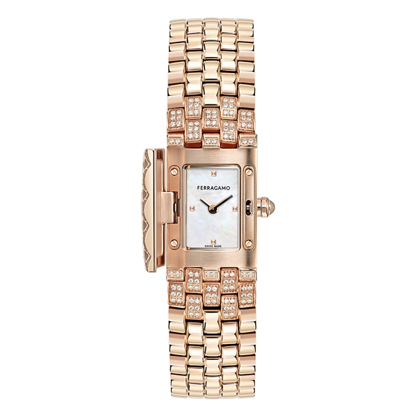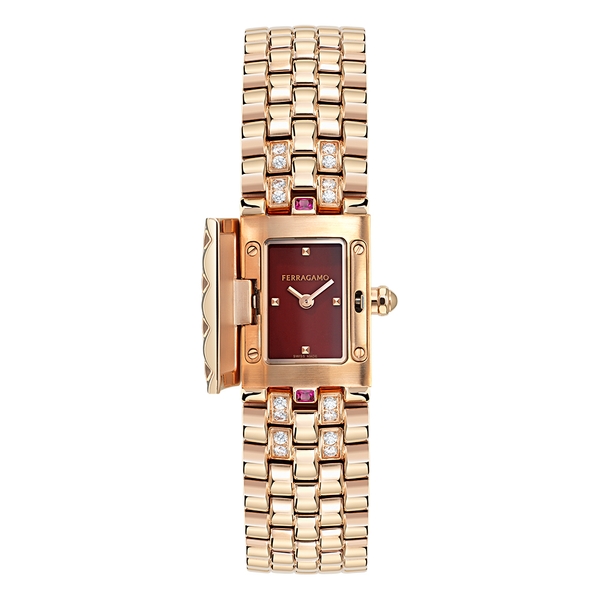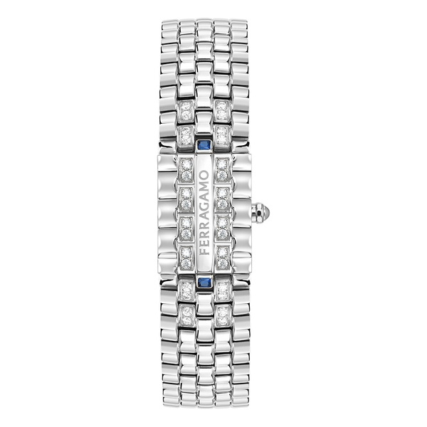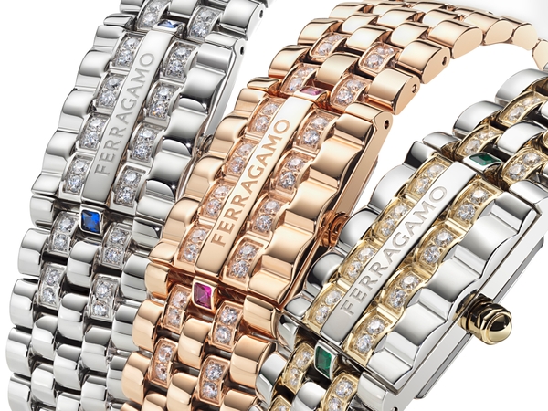 ● ケース: 長方形 18x30mm ● ムーブメント: クオーツ2針 (ロンダ1032) – スイス製 ● ダイアル: 4バージョン: ラピスラズリ/マラカイト/赤メノウ/マザーオブパール ● ブレスレット: 2バージョン:ダイヤモンド32個(0.96ct)とスクエアカットのブルーサファイアかエメラルドかルビー付きスティール/ダイヤモンド188個 (0.85ct)付きスティール – Ferragamoロゴ入りバタフライバックル ● 防水: 30メートル