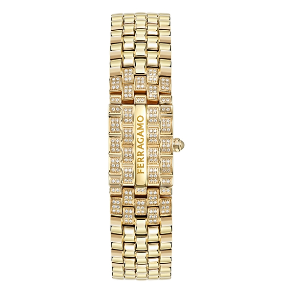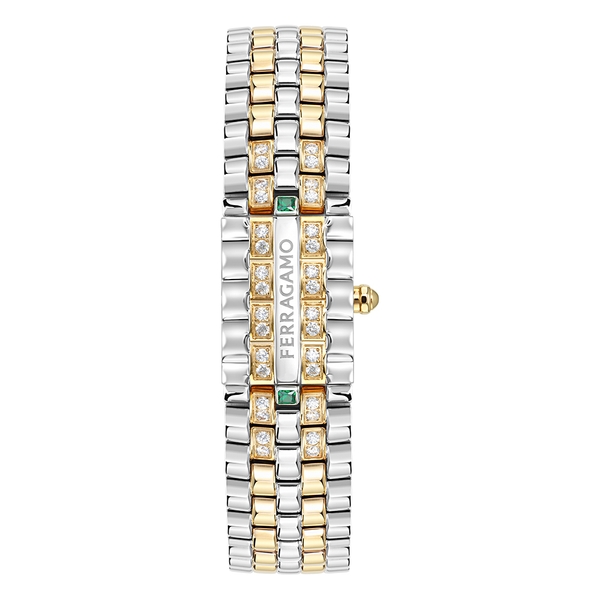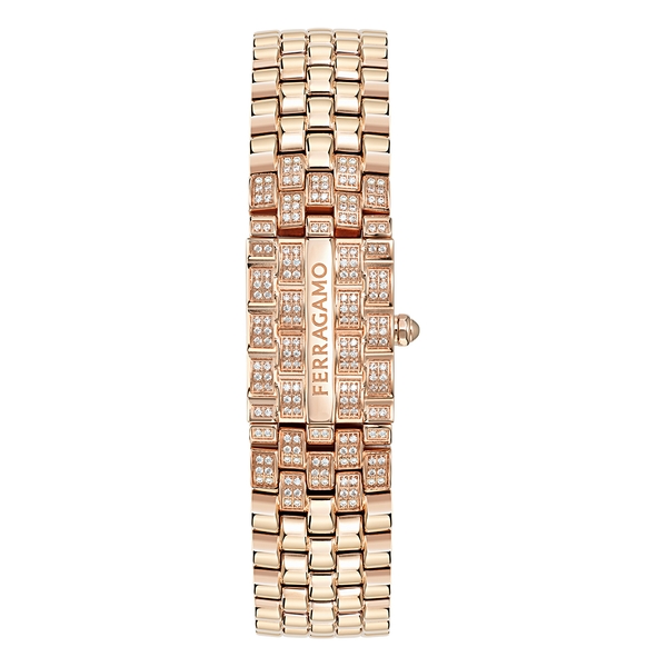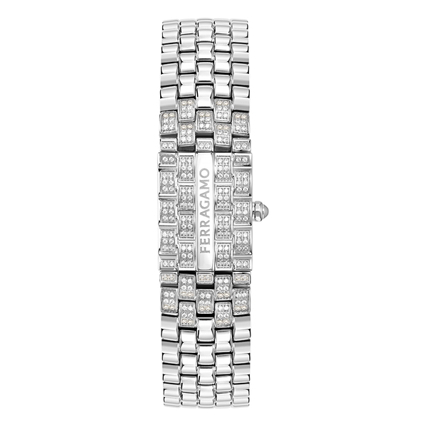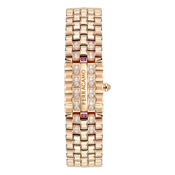 縦にフェラガモのロゴが刻まれたモバイルパネルにも見られる5連ブレスレットの丁寧な細工が、このモデルをさらに引き立てています。文字盤のフレーム、針、インデックスにあしらわれた小さなスタッズは、メタル仕上げの光沢を想起させ、時計の外装と内装の美的な連続性を反映しています。