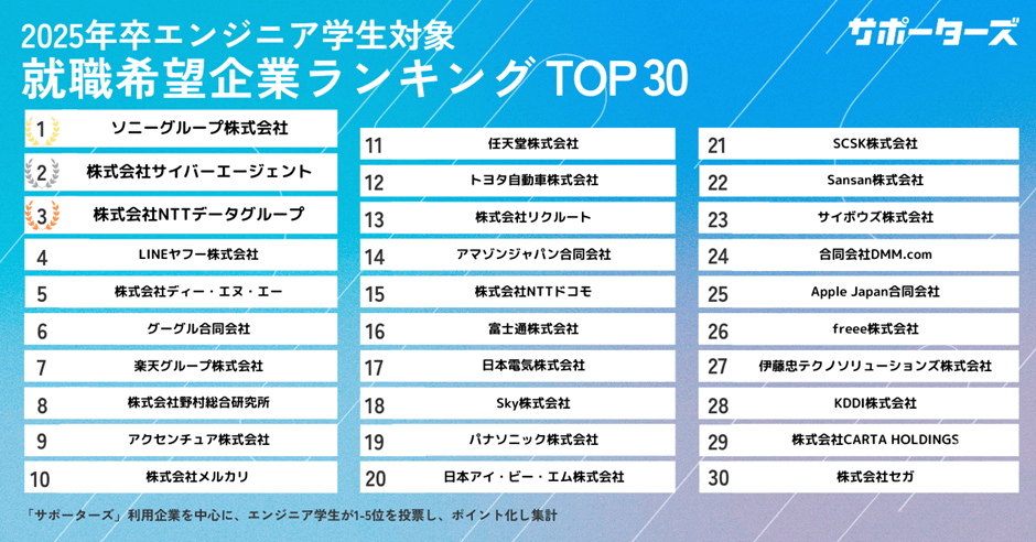 サポーターズ、「2025年卒 エンジニア学生対象 就職希望企業ランキング」TOP30を公開!