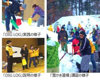 雪かき道場師範代による注意点などの講習の座学、雪かきの仕方を学ぶ基礎実技、実際に集落の住宅周りで実践実技の演習を行い、実技プログラムの中で「DIG LOG」を使用しました。