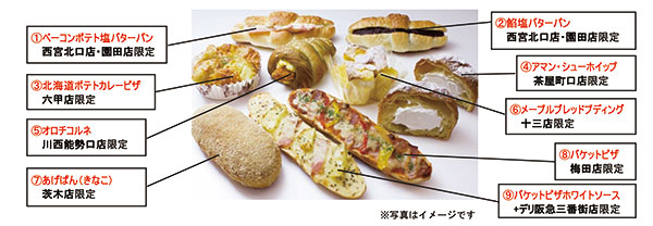 六甲店の北海道産ポテトを使ったボリューム満点の「北海道ポテトカレーピザ(【3】)」や十三店のスイーツパン「メープルブレッドプディング(【6】)」など、店長それぞれの想いをかたちにしました。