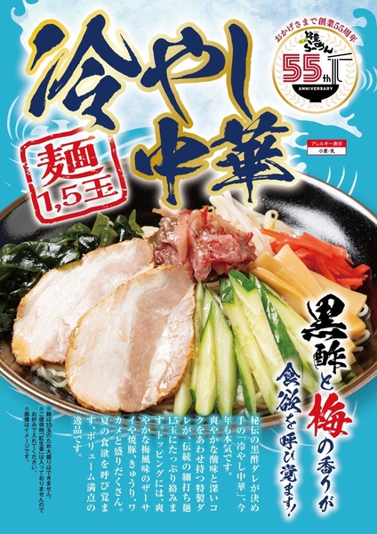 『九州筑豊ラーメン』ブランドのチェーン展開や食材の卸売りをおこなうワイエスフード株式会社(本社:福岡県田川郡香春町鏡山552-8/代表取締役社長 小川 光久 以下、当社)は、1970年創業の『九州筑豊ラーメン』の創業55周年を記念した新メニュー企画第二弾として、自家製のタレに黒酢を加えた特製黒酢ダレを使用した「冷やし中華」と、サイドメニューの餃子を夏にぴったりな爽やかな味わいにアレンジした「ねぎ塩レモン餃子」を販売します。