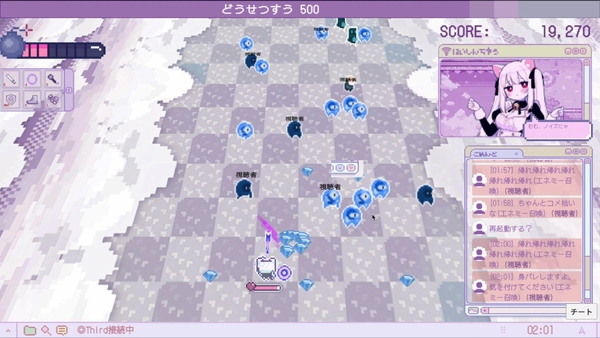 本作は襲いかかる敵を倒し続けるシューティングゲームですが、最大の特徴は「THIRD」システムによる視聴者の介入です。視聴者が配信を盛り上げるためにあえて敵を増やしたり、絶体絶命のピンチで救いの手を差し伸べたりといった、配信者と視聴者がリアルタイムで感情を共有する体験が大きな反響を呼んでいます。