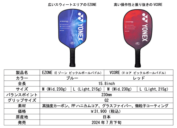 ヨネックス株式会社(代表取締役社長:アリサ ヨネヤマ)は、米国で爆発的に流行している新スポーツ「ピックルボール」の日本国内市場に新規参入いたします。第一弾として、弊社独自のカーボン技術を搭載したピックルボールのパドル「EZONE(Eゾーン)/VCORE(Vコア)」を、一部のスポーツ用品店、弊社公式オンラインショップおよび弊社東京ショールームにて、2024年7月下旬より順次発売いたします。