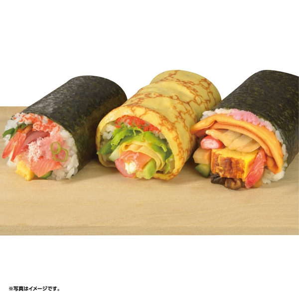 生サーモン・ずわいがに・甘海老・とびっこ・マヨネーズなどが入ったサラダ風の太巻を薄焼き玉子で巻いた、お子様にも人気の太巻。