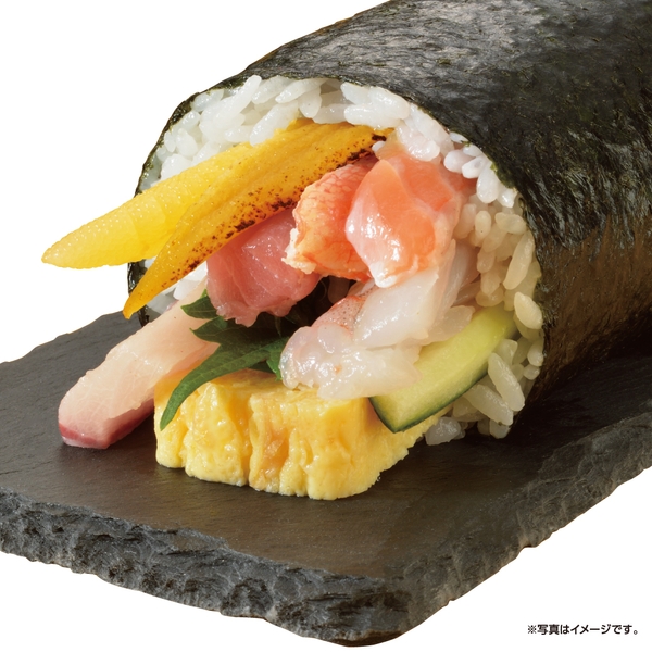 北海道産帆立や伊勢黒潮まだい・ずわいがに・数の子などバイヤーが厳選した8種類の具材が入った極太太巻。