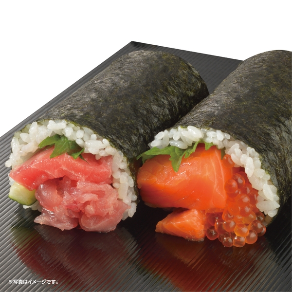 「たっぷり具っ!本鮪とろ入りまぐろ節分巻」「たっぷり具っ!サーモン節分巻」の2種類が入った、鮪とサーモンのおいしさを両方楽しめる贅沢なハーフサイズのセット。