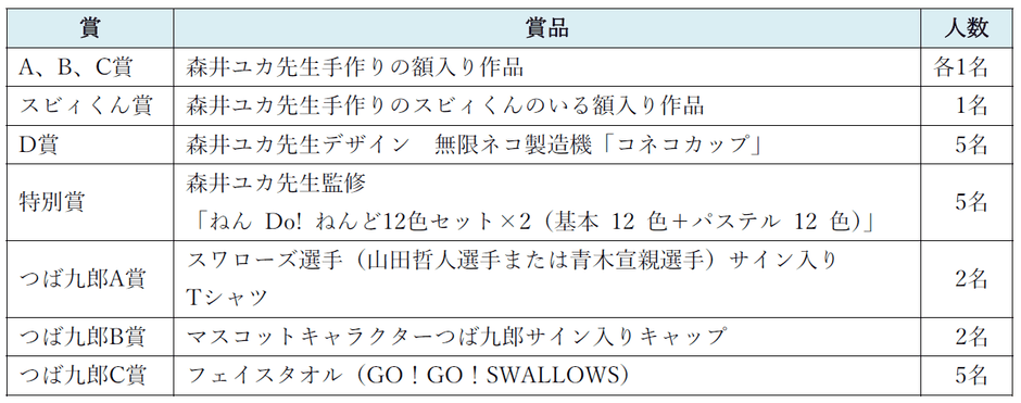 受賞者には森井ユカ先生手作り作品や東京ヤクルトスワローズ選手のサイン入りグッズなどをプレゼント