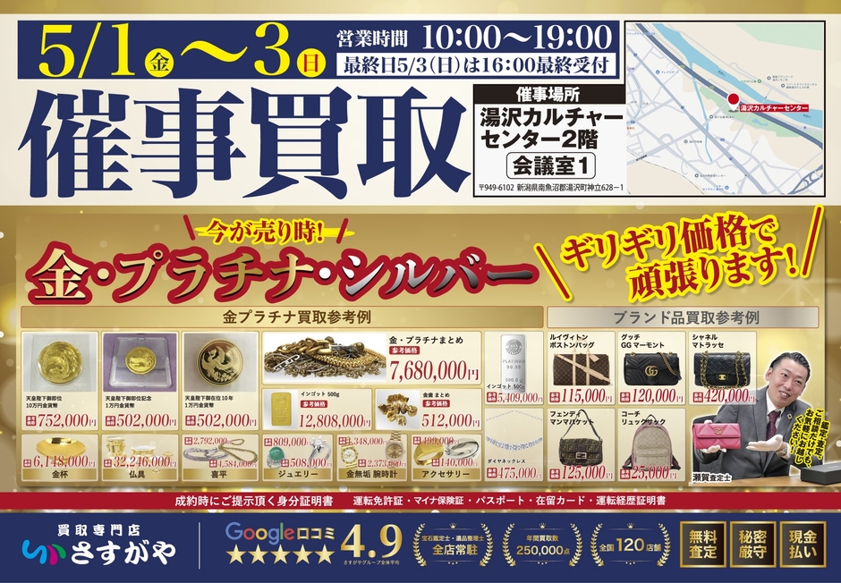 買取専門店さすがやは、2026年5月1日(金)〜5月3日(日)の期間、湯沢カルチャーセンターにて期間限定の買取催事を実施いたします。
