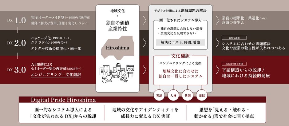 クラウドサービスの普及などによりデジタル技術が標準化・画一化する中で、多くの企業は既存のシステムに業務を合わせることを求められてきました。 その結果、独自の業務プロセスや企業文化が反映されにくく、その地域や企業ならではの価値・競争力の源泉が失われつつあるという課題がありました。「Digital Pride Hiroshima」は、地域の文化や企業の誇りを深く理解し、それをデジタルの力で翻訳・実装する「文化翻訳」というアプローチで、地域に根差した持続的な成長を支援します。