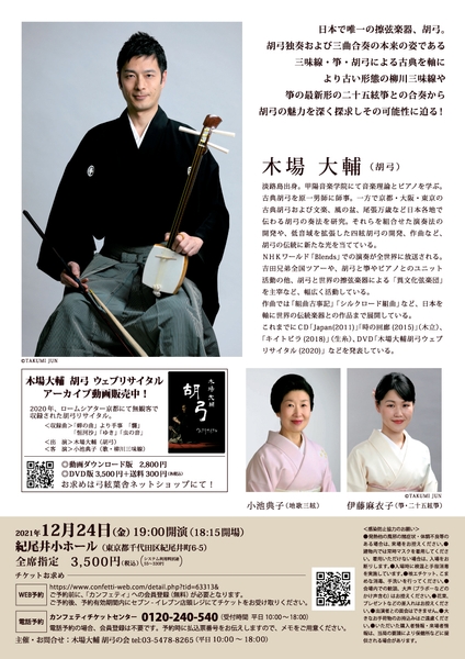 木場大輔 胡弓の会主催による「木場大輔 胡弓の会2021」が2021年12月24日 (金)に紀尾井小ホール(東京都千代田区)にて開催されます。チケットはカンフェティ(運営:ロングランプランニング株式会社、東京都新宿区、代表取締役:榑松 大剛)にて発売中です。