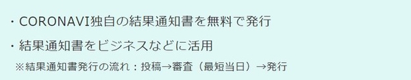 CORONAVIでは独自の検査結果通知書を最短当日中に無料で発行しております。