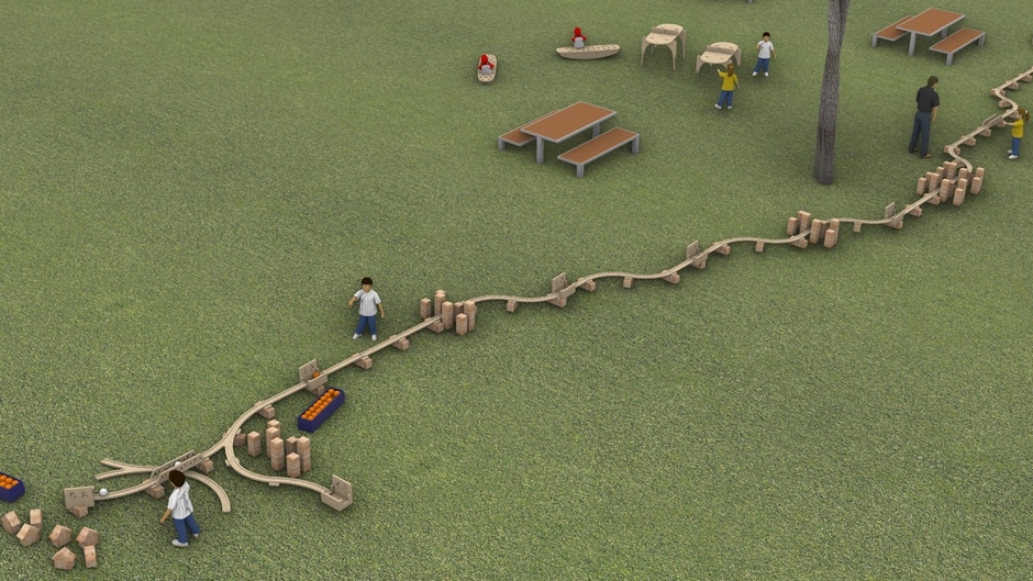 最長30メートルの木製レールをつなげて線路を作り、電車に見立てたボールをコロコロと転がして遊びます。場所:ピクニック広場 参加費:無料