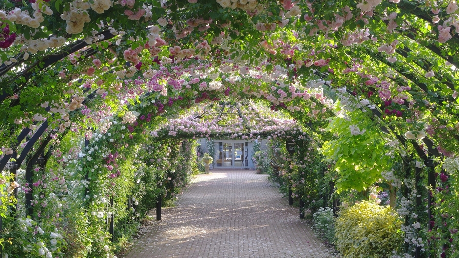 トピアリー(植物を刈り込んで造った立体造形)などで装飾を施したガーデンがお出迎え