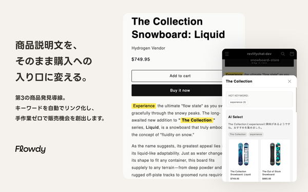 Flowdyは、商品説明文やブログ記事内のキーワードをAIが自動でハイライト化し、クリックするだけで関連商品をその場に表示するShopifyアプリです。