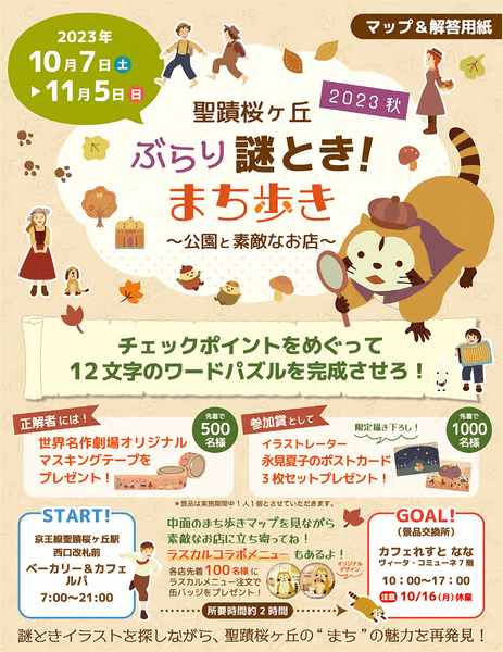 2023年10月7日(土)~11月5日(日)の期間、京王線聖蹟桜ヶ丘駅周辺を巡るイベント「聖蹟桜ヶ丘 ぶらり謎とき!まち歩き」が開催されます。聖蹟桜ヶ丘駅西口改札前からスタートして、ヒントイラストを探し、指示に従って謎ときを楽しんでください。