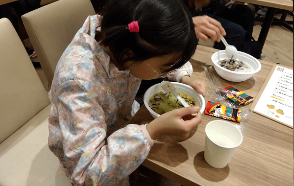 永谷園からは、朝食の大切さについてのお話とお茶づけの試食を行いました。試食の際には、「お茶づけに合うトッピング」を売り場で探し、多数決で選ばれた食材を実際にのせて食べていただきました。
