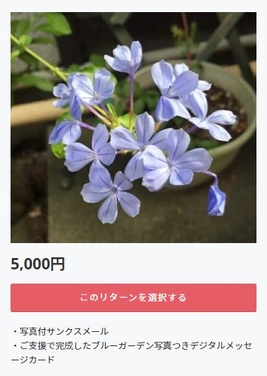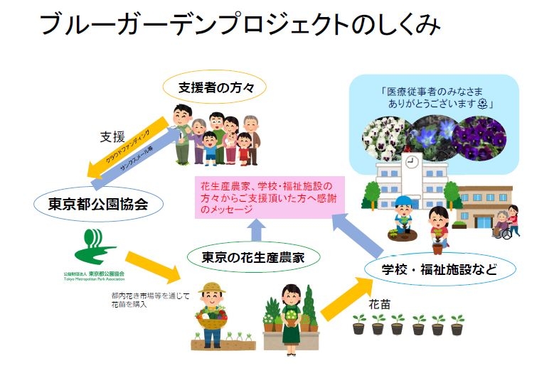 ブルーガーデンプロジェクトは、クラウドファンディングにて皆さまからの支援金を集め実施します。集まった支援金により、花生産農家から花苗を購入し、都内の小中学校や社会福祉施設等に配布します。青い花を基調としたブルーガーデンをつくって医療従事者の方々へ感謝の気持ちを表します。