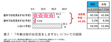 次に、今年のお花見の予定を訪ねました。「屋外でお花見をする(予定)」人は41.3%、「屋内でお花見をする(予定)」人は5.5%。これに対して「しない(予定)」の人が55.1%でした。お花見をする予定としない予定は、ほぼ二分する結果で、しない予定の人がする予定の人をやや上回りました。あくまで1月下旬から2月上旬に実施した調査結果であり、実際に桜が咲き始めたら、花見に出かける人がもう少し増える可能性はありそうですね。