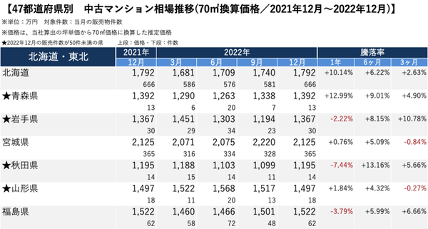 *1 当社が保有する中古マンションの販売履歴データを元に「坪単価」を算出し、70㎡での価格に換算した推定価格。 *2 当月(2022年12月)の販売件数。