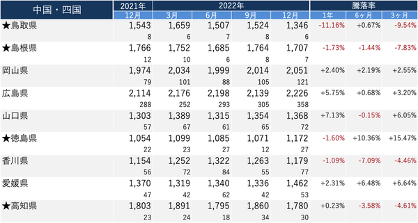 【中国・四国】 価格:「広島県」 2,226万円/騰落率:「山口県」 +7.13%