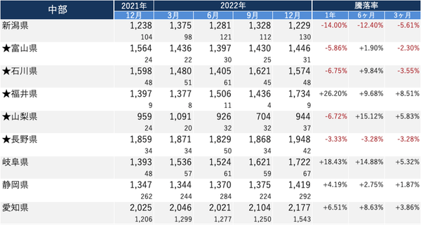 【中部】 価格:「愛知県」 2,177万円/騰落率:「岐阜県」 +18.43%